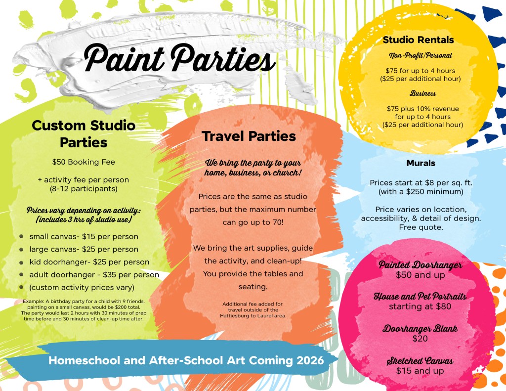 Paint parties can be pre-sketched canvases/doorhangers or a guided step-by-step style painting- all your choice and custom created for what you need. Designs are created to be perfect for beginners, and a host will be on hand for help and touch-ups when needed! Check out our details below and feel free to reach out for any questions. Let us know if you’d like to snag a date for your event! You can also reach us at 601.270.4171.